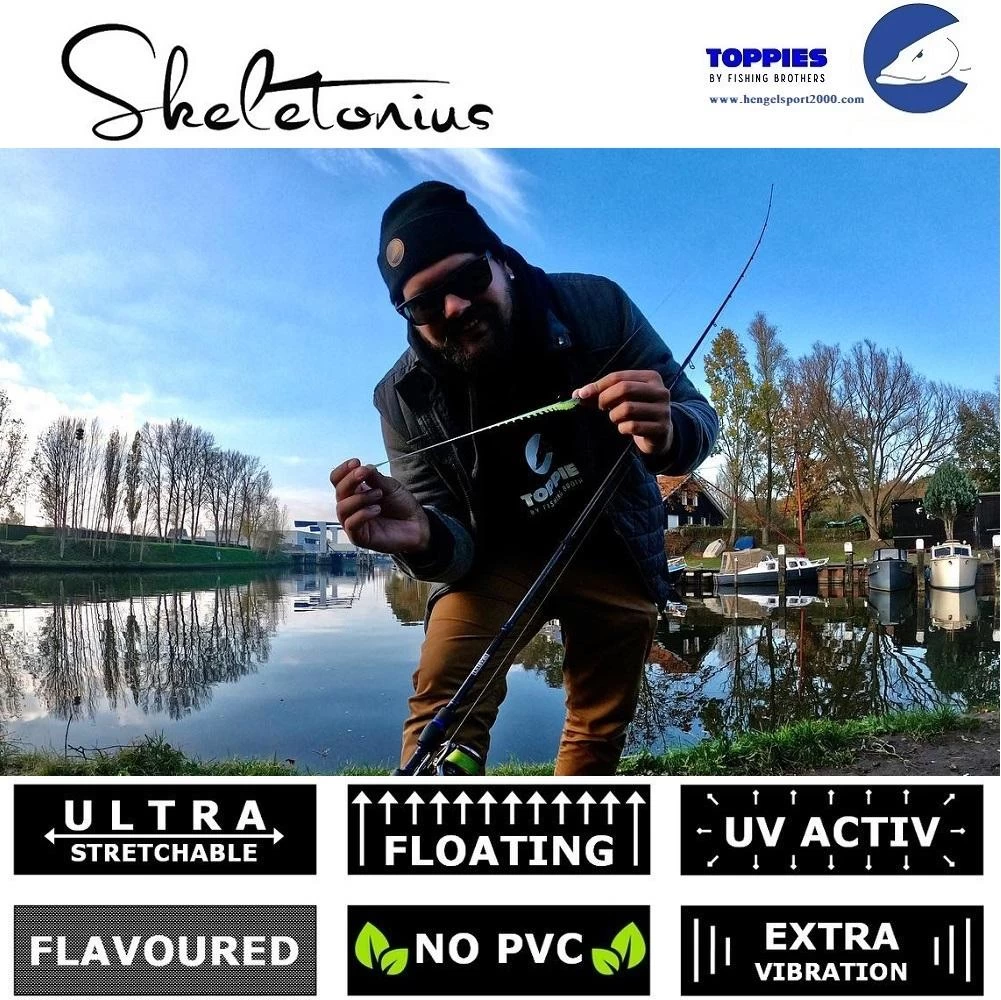 gearomatiseerd – met smaak, drijvend materiaal zodat de Skeletonius opstaat als een kleine vis, individuele kleuren uitgerust met UV-actief buikgebied. Haakkanaal, voor een perfecte tuigage van het aas en natuurlijk volgens onze filosofie “lood- en gifvrij”: Zoals alle Toppies softbaits is de Skeletonius door ons in Zwitserland ontworpen, getekend in CAD en de prototypes gegoten in de eigen werkplaats van het bedrijf. Na verschillende prototypeversies en mooie vangsten van onze testvissers is hij eindelijk klaar voor de markt.